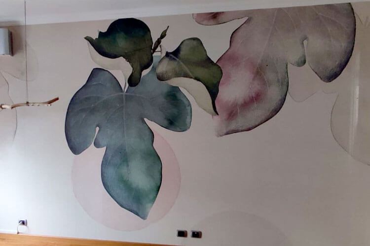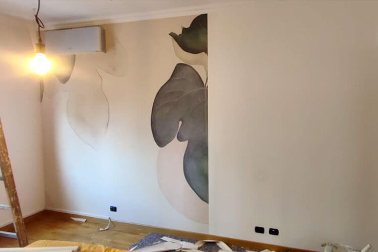 Solo una volta terminata questa fase abbiamo proceduto con la preparazione dei fogli di carta da parati, l’applicazione del fissativo e infine il fissaggio.